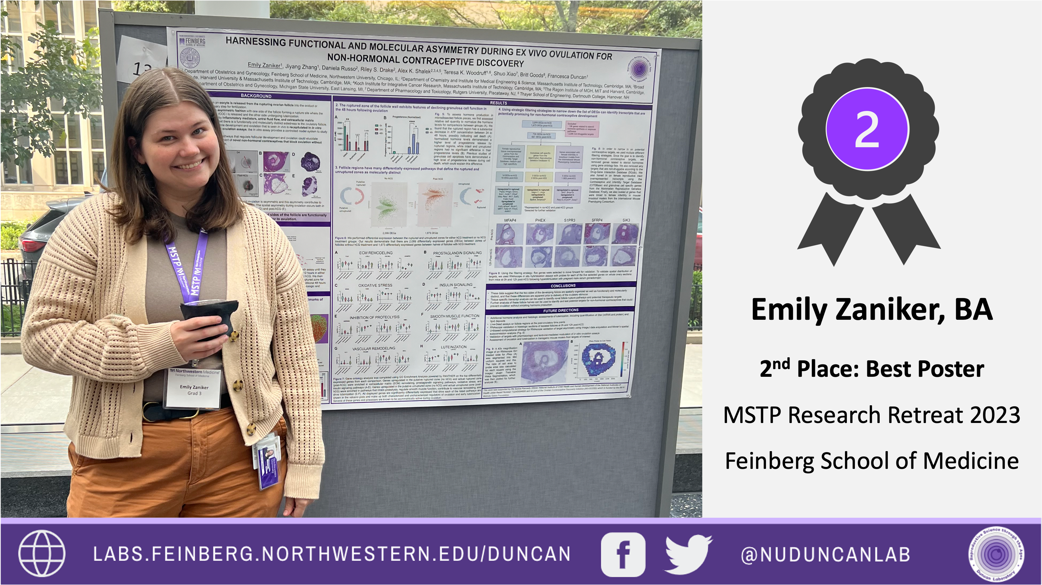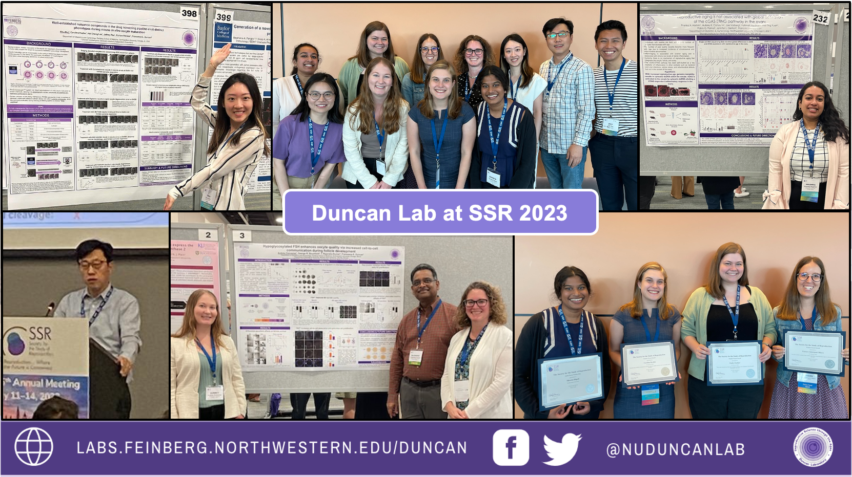 - On January 29, Dr. Duncan presented the RV Short Medal Lecture, a joint initiative of the Society for Reproductive Biology, the Society for Reproduction and Fertility, and the Society for the Study of Reproduction. Dr. Duncan presented on a decade of groundbreaking research from her lab on the ovarian microenvironment to an audience of over 350 in person and virtual attendees at Northwestern, CRS, SSR, SRB, and SRF. Congratulations to Dr. Duncan on this amazing achievement! You can read about Duncan's award in this Breakthroughs article and watch the full lecture at this link.
