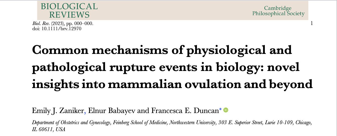 - A New Duncan Lab Publication: Huang R, Kratka CE, Pea J, McCann C, Nelson J, Bryan JP, Zhou LT, Russo DD, Zaniker-Gomez EJ, Gandhi AH, Shalek AK, Cleary B, Farhi SL, Duncan FE, Goods BA. Single-cell and spatiotemporal profile of ovulation in the mouse ovary. PLoS Biol. 2025 Jun 24;23(6):e3003193. doi: 10.1371/journal.pbio.3003193. PMID: 40554460; PMCID: PMC12186953.
