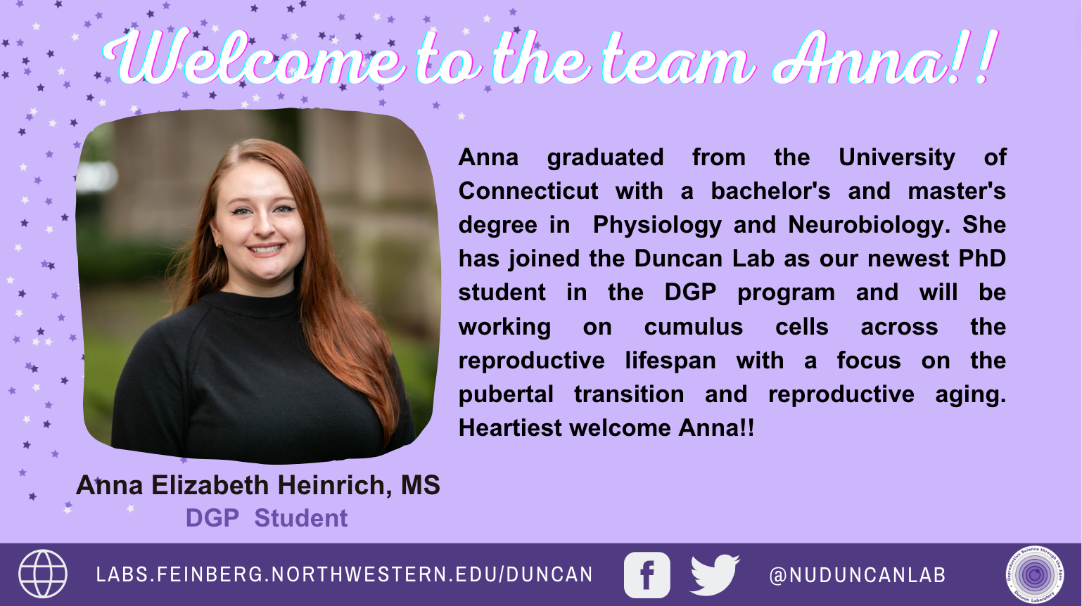 - Congratulations to three former members of the Duncan Lab - Julia Balough, MS, Shweta Dipali, PhD, and Karen Velez MS - who have co-authored a comprehensive review on Hallmarks of female reproductive aging in physiologic aging mice which was published as part of a special issue in Nature Aging (Focus on Reproductive Aging)!