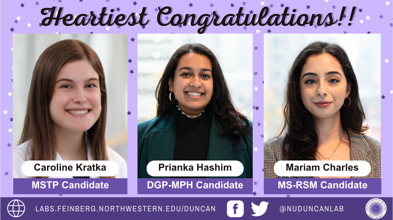 - Members of the Duncan Lab participated in the 19th Annual Lewis Landsberg Research Day held at Northwestern University on September 11th, 2025. Dylan Hakken was shortlisted as a finalist for the Best Poster award in the Basic Science Research category.